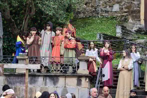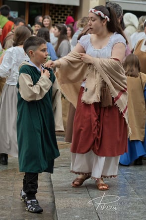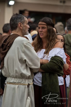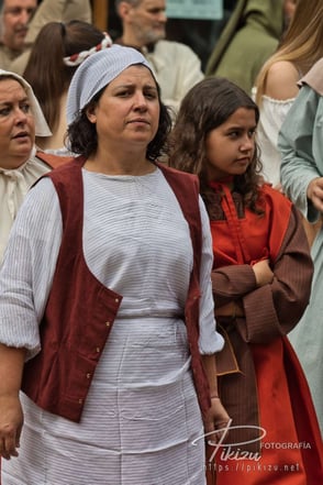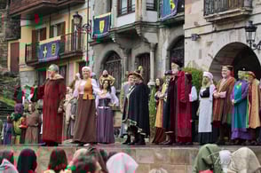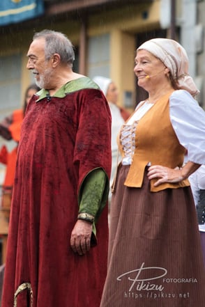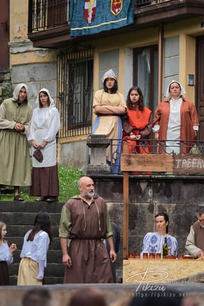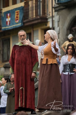 Más de un centenar de vecinos interpretan a diversos personajes, ataviados con ropas medievales, sobre el escenario instalado frente al ayuntamiento en la plaza de San Severino. Se representan una docena de hechos históricos, de forma que todos los años varía la temática, unas veces es la elección del primer alcalde, otras las ferrerías, el chacolí, o la concesión del Fuero de Logroño como ha sido el tema de este año.